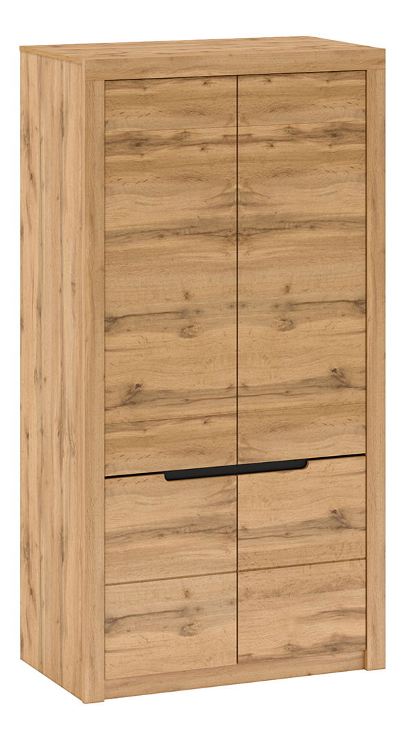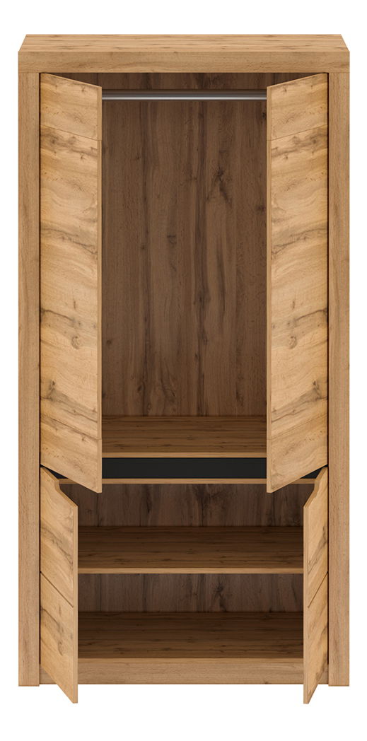Šatníková skriňa Toriana F v dub wotan farbe s výškou 197,2 cm a hĺbkou 56 cm je vyrobená z DTD laminovaného materiálu s MDF dverami. Rozmery skrine sú 102,8x56x197,2 cm a hrúbka materiálu korpusu je 16 mm. Skriňa je štvordverová so špeciálnou vešiakovou tyčou a poličkou. Produkt je dodávaný v demonte a je vhodný pre každú spálňu, kde poskytuje dostatok skladovacieho miesta pre vaše oblečenie a doplnky. S touto skriňou si môžete byť istí, že vaša spálňa bude vyzerať elegantne a dobre zorganizovane.
