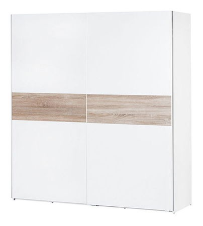 Šatníková skriňa z modernej modelovej rady Venecia oživí Vašu spálňu, alebo iný priestor v byte. Skriňa má bezúchytový systém s posuvnými dverami. Korpus a dvierka sú vyrobené z kvalitného LTD bielej farby s pruhom vo farbe dreva dub sonoma. V úložnom priestore sa nachádzajú dve vešiakové tyče a nad nimi je umiestnená polička. Ku skrini si môžete priobjednať dve poličky a tichý dojazd dverí.