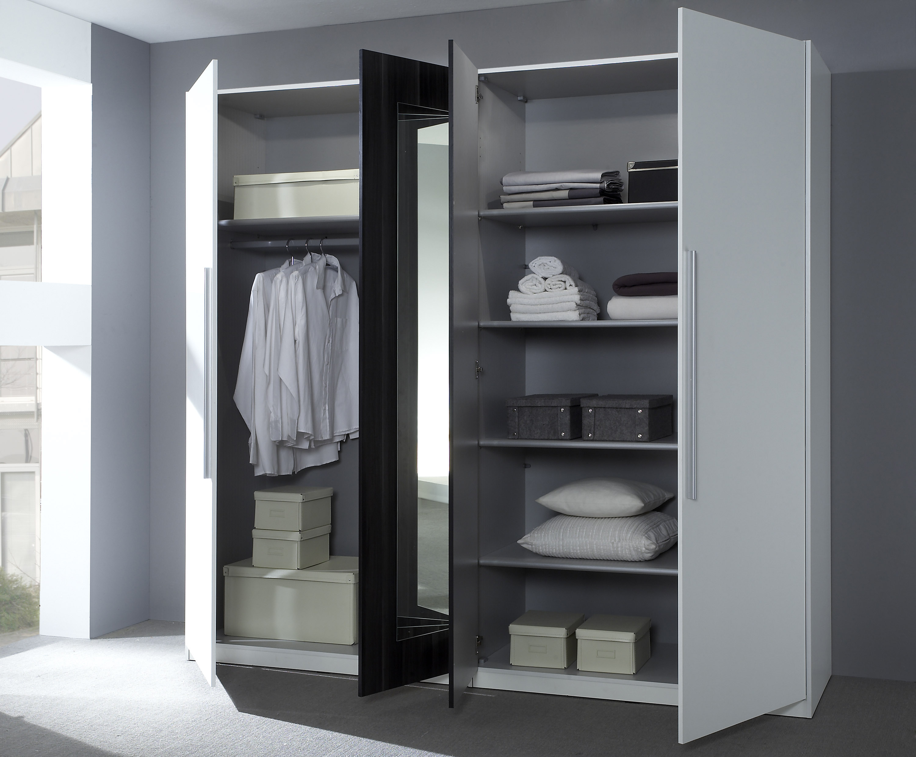 Kombinácia moderného dizajnu a súčastných trendov je charakteristická pre tento modelový rad. A máte si z čoho vyberať. Priestranná šatníková skriňa, komoda, posteľ v dvoch rozmeroch predávaná spolu s nočnými stolíkmi. Tie sú neoddeliteľnou súčasťou postele a nedajú sa zakúpiť samostatne. Skriňa má na dverách umiestnené zrkadlá. Vnútorné usporiadanie je nasledujúce: vpravo sa nachádza priestor s poličkami a vľavo je vešiaková tyč, nad ktorou je umiestnená polička.
