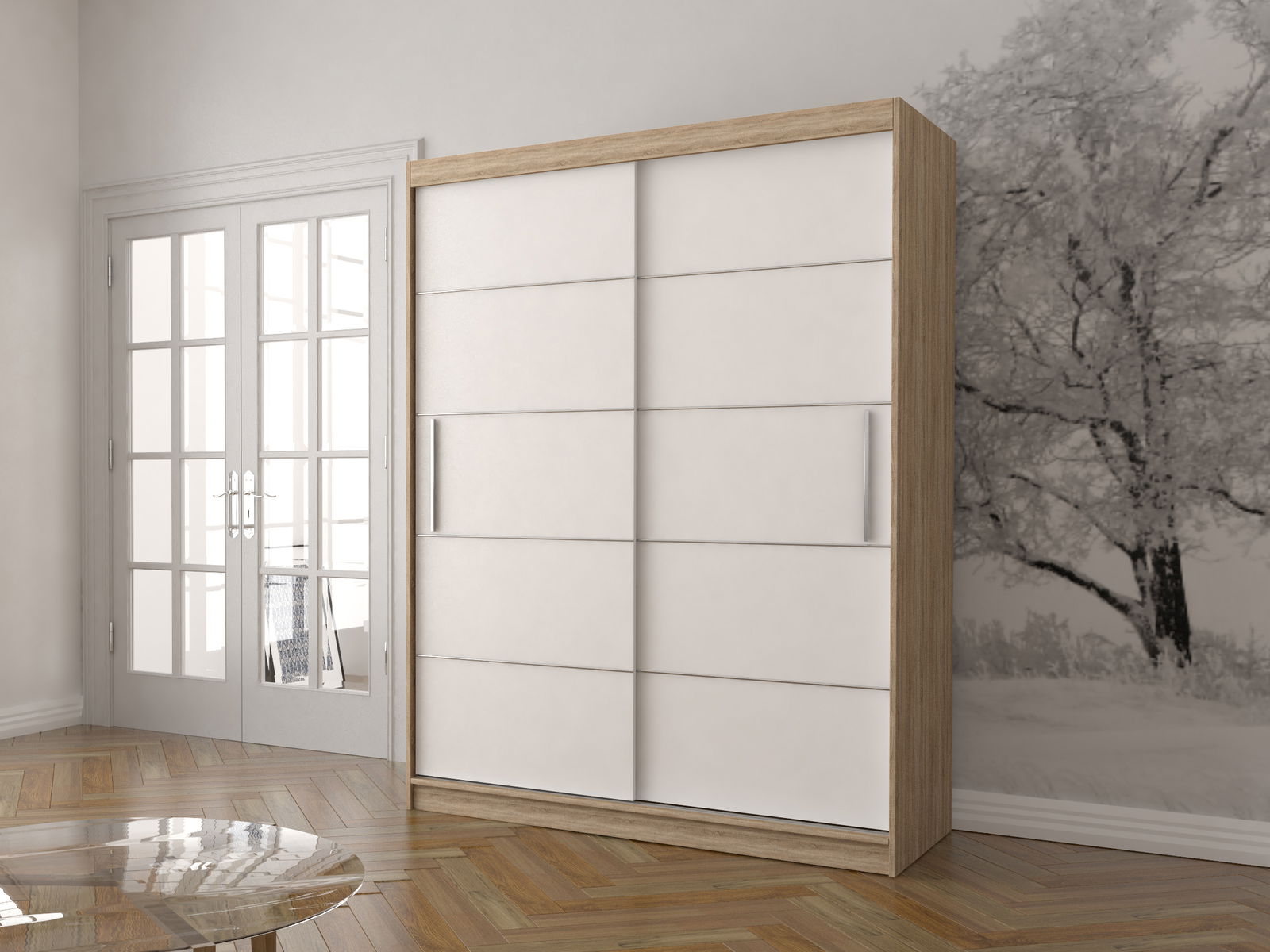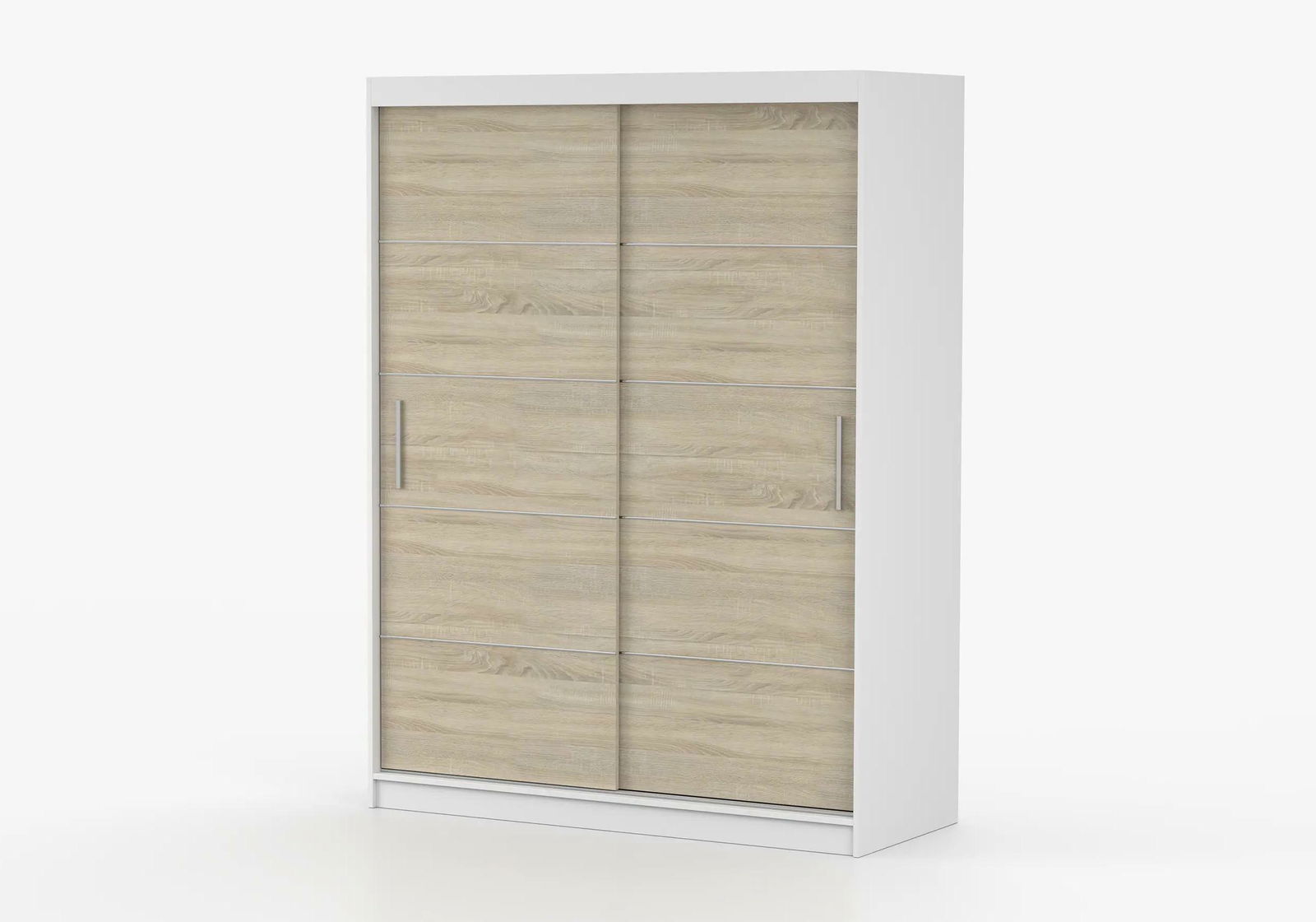 Šatníková skriňa Viola 06 (biela + dub sonoma) s výškou 200 cm, šírkou 150 cm a hĺbkou 61 cm je ideálna voľba pre moderné domovy. Je vyrobená z kvalitnej 16 mm hrubej drevotriesky, čo zaručuje pevnosť a odolnosť. Skriňa má okraje s ABS hranami hrúbky 0,5 mm, čo zabezpečuje ich odolnosť a príjemný vzhľad. Vrchné uchytenia v tvare písmena "L" z PVC pridávajú skrini moderný nádych a sú pevne pripevnené šróbovým spôsobom. Táto skriňa je vybavená jednou pozdĺžnou tyčou na pravej strane na zavesenie odevov. Okrem toho ponúka päť poličiek, z ktorých štyri sú na ľavej strane a jedna na pravej. Toto usporiadanie zaisťuje efektívne usporiadanie a organizáciu odevov a iných vecí. Skriňa je univerzálna a neobsahuje zrkadlo, čo umožňuje jej využitie v rôznych typoch miestností. Šatníková skriňa Viola 06 (biela + dub sonoma) je praktickým a esteticky príťažlivým kusom nábytku, ktorý sa hodí do každého moderného bytu či domu. Svojou kvalitou a dizajnom poskytuje dostatok úložného priestoru a prispieva k upratanému a štýlovému interiéru.