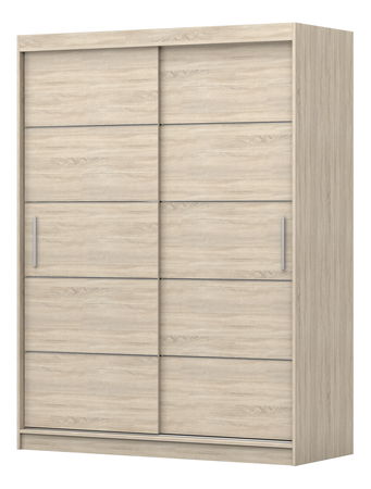 Šatníková skriňa - Viola 06 (dub sonoma + dub sonoma) výška 200 cm šírka 150 cm hĺbka dub sonoma + dub sonoma 61 cm. Táto šatníková skriňa je vhodná pre moderné domovy. Je vyrobená z 16 mm hrubej drevotriesky, ktorá je použitá na vonkajšiu aj vnútornú stranu. Okraje skrine sú ošetrené 0,5 mm hrubými ABS hranami, ktoré zvyšujú odolnosť a kvalitu. Skriňa má zvislé úchytky z PVC v striebornej farbe, ktoré dodávajú skrini moderný vzhľad. Skriňa nie je vybavená zrkadlom, čo zvyšuje jej univerzálnosť v rôznych typoch miestností. Vo vnútri skrine sa nachádza jedna tyč na zavesenie odevov na pravej strane. Celkovo ponúka päť poličiek, z ktorých štyri sú na ľavej strane a jedna na pravej. Toto rozloženie poličiek umožňuje efektívne usporiadanie a organizáciu odevov a iných predmetov. Táto šatníková skriňa je praktickým a esteticky príťažlivým kusom nábytku, ktorý sa hodí do každého moderného bytu či domu.