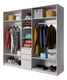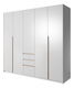 Priestranná šatníkova skriňa, ktorá sa sklada z viacerých častí. Po stranách ma vešiakovú tyč a v strede skrine sa nachádzajú štyri police a tri zásuvky. K šatníkovej skrini si viete doobjednať LED rám.