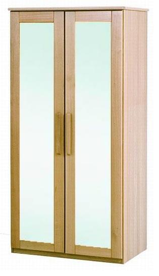 Dvojdverová šatníková skriňa Petra P2 DD. Pravá časť skrine je policová s piatimi policami a ľavá šatníková s jednou policou v hornej časti. Na oboch dverách sú zrkadlá