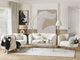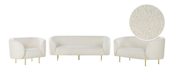Vďaka jemne zaobleným tvarom a zlatým nohám pôsobí táto nádherná sedacia súprava luxusným dojmom. Je čalúnená buklé tkaninou, takže je pohodlná a príjemná nielen na pohľad, ale aj na dotyk. Hrubé čalúnené sedadlo poskytuje pohodlné sedenie, vďaka čomu je ideálnym miestom na čítanie alebo sledovanie televízie. Elegantný dizajn súpravy skvele doplní interiéry v eklektickom, tradičnom alebo mid-century štýle.