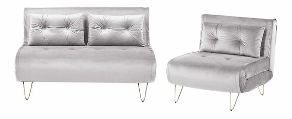 Vneste do svojho interiéru nádych elegancie s touto praktickou a očarujúcou rozkladacou sedacou súpravou s odolným zamatovým čalúnením, ktoré je mimoriadne jemné na dotyk. Sedacia súprava má hrubé sedadlá a operadlá, je veľmi pohodlná a jej elegantný dizajn zvýrazňujú zlaté kovové nohy. Vankúše s ozdobným prešívaním majú snímateľné poťahy a vďaka nim je pohovka ešte pohodlnejšia. Jednoduchý rozkladací mechanizmus umožňuje rýchle rozloženie nábytku, ktorý výborne poslúži aj ako posteľ pre hostí.