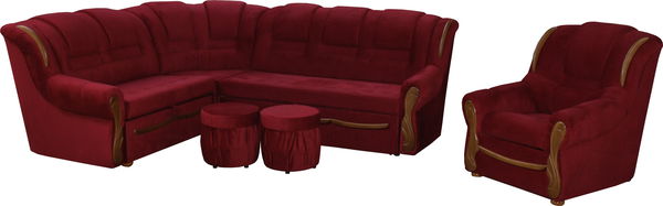 Rohová sedacia súprava univerzálneho vyhotovenia Baron tvorí elegantný celok zaujímavý svojím zdobením drevom Rustikál použitým na opierkach, prednej časti podrúčiek a prednej časti sedáka. Farebné prevedenie je 3749 bordó. Sedačka má úložný priestor. Sedák je vyrobený z pružiny bonel, čím je zaručený komfort mäkkého sedenia a tvarová trvácnosť sedačky. Sedačka je rozkladacia a rozmer ložnej plochy po rozložení bude 200 cm dĺžka a 125 cm šírka. V súprave sa nachádzajú 2 taburetky s valcovým tvarom a aj jedno kreslo, ktoré má pod sedákom úložný priestor.