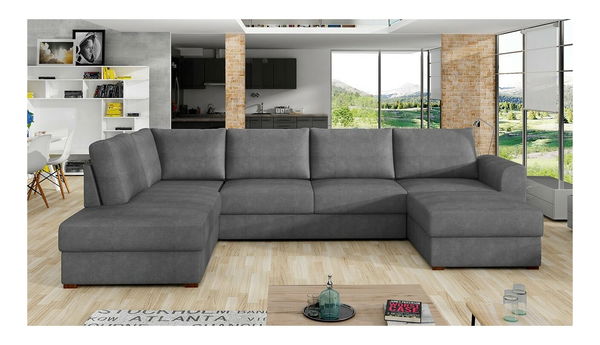 konštrukcia sedadla: drevený rám + falista pružina + plsť + pena T2844 s hrúbkou 11 cm, konštrukcia operadla: drevený rám + HDF doska + 1 cm hrubá T2844 pena, funkcia rozkladu, funkcia spania, sedacia súprava v tvare U, s úložným priestorom, vankúše v cene (6 veľkých) - na zips, drevené nohy (tmavý orech), voľne stojaca sedacia súprava (čalúnená látkou)