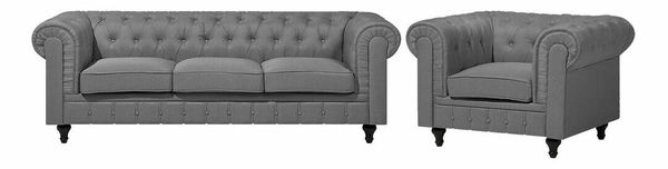 Táto sedacia súprava sa vyznačuje elegantnou siluetou so širokými zaoblenými ramenami, ktorá je charakteristická pre dizajn Chesterfield a hodí sa do každého moderného alebo tradične zariadeného interiéru. Nízke operadlo, hrubé čalúnené sedadlo a nohy z eukalyptového dreva ponúkajú ten najlepší komfort a stabilitu. Kvalitné látkové čalúnenie v nadčasovej sivej je zvýraznené klasickým prešívaním a gombíkmi. Táto anglická klasika sa ľahko udržiava a bude vyzerať úžasne v tradične zariadenom alebo modernom interiéri.