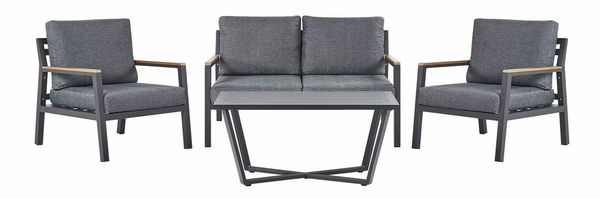 Pripravte svoj vonkajší priestor na leto s touto štýlovou, modernou záhradnou súpravou. Pozostáva z dvojmiestnej pohovky, kresiel a obdĺžnikového konferenčného stolíka a poskytne vám a vašim priateľom dostatok priestoru na vychutnávanie si slnečného počasia a oddych na terase. Každé sedadlo je vybavené hrubým sedacím vankúšom v tmavosivej farbe, ktorý dodatočne zvyšuje komfort počas sedenia. Rámy sú vyrobené z hliníka nenáročného na údržbu a opierky rúk sú ozdobené materiálom pripomínajúcim drevo.