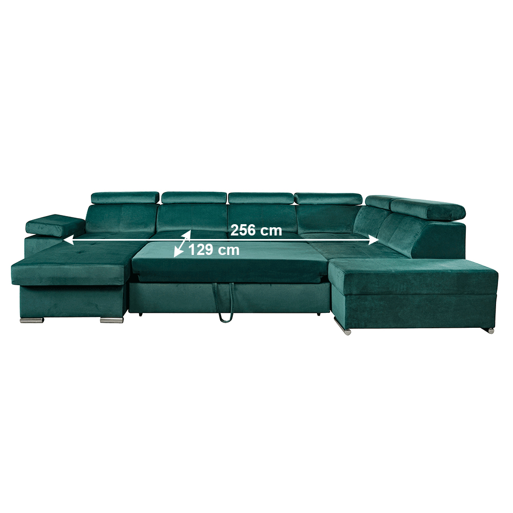 Sedacia súprava Lamour (smaragdová) (L) s výškou 79-97 cm, šírkou 329 cm a hĺbkou 220 cm je štýlová a moderná sedačka, ktorá zaručuje komfort a miesto na relax. Sedačka v tvare U ponúka veľkorysé rozmery a elegantnú smaragdovú farbu, ktorá dodá vašej obývačke exkluzivitu a luxus. Sedačka je celočalúnená kvalitnou látkou KRONOS a má až šesť polohovacích opierok hlavy, ktoré sa dajú prispôsobiť v piatich stupňoch. Polohovacia opierka na ruky vyzdvihne jej pozitíva na maximum a disponuje aj úložným priestorom. Lamour je rozkladacia, pohodlne sa na nej vyspia dvaja ľudia a plocha na spanie dosahuje rozmerov 129x256 cm. Sedačka má 6 kovových nôh vo výške 4,5 cm od zeme a jej jadro je tvorené pružinami falista a penou v hrúbke 10 cm pre vyšší komfort sedenia. S týmto kvalitným prevedením a moderným dizajnom sa sedačka Lamour stane ústredným prvkom vašej domácnosti a ponúka priamo u vás doma miesto na plnohodnotný oddych.