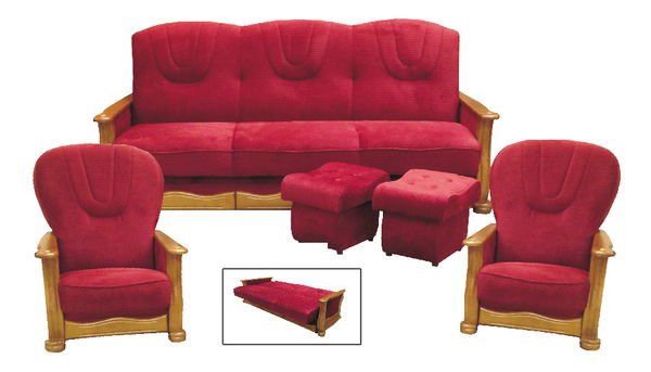 Luxusná sedacia súprava v klasickom štýle, ktorá má rám vyrobený z dreva rustikál a je čalúnená kvalitným šenilom. Na výber máte z piatich farebných prevedení. Trojsed je rozkladací a obsahuje úložný priestor. V súprave sú ešte dve kreslá a dve taburetky.