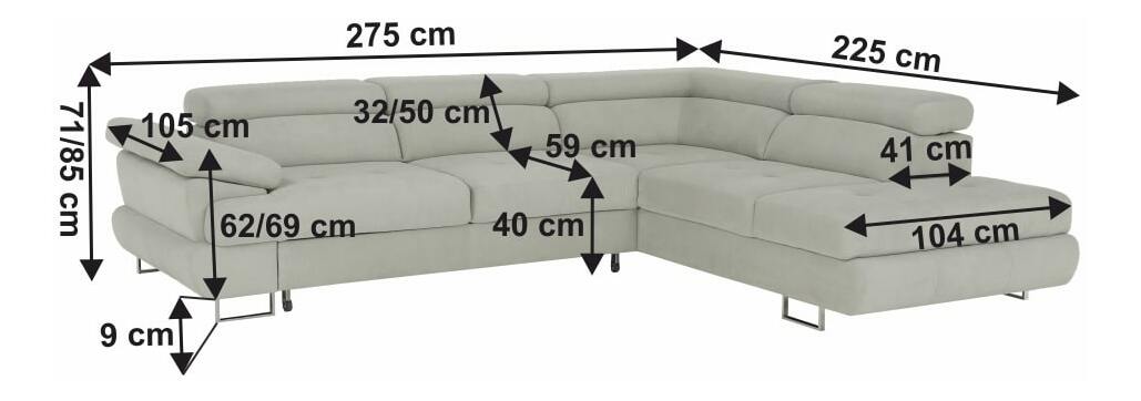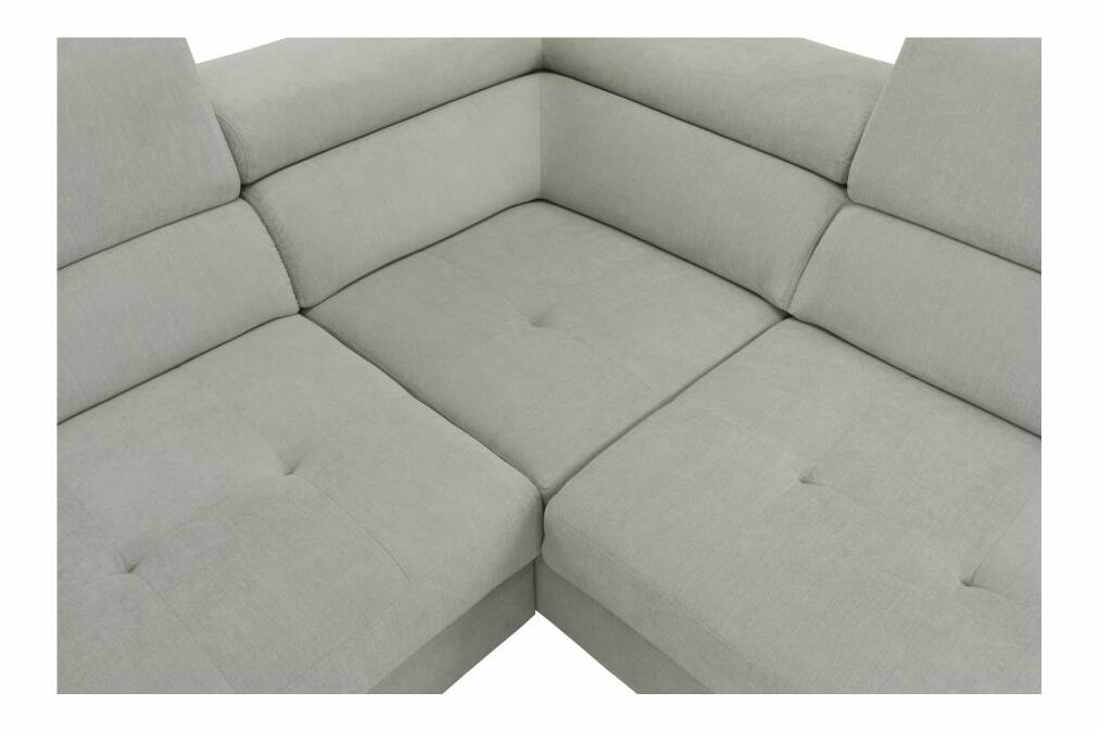 Rohová, Rozkladacia, S úložným priestorom, Dekoratívne prešitie, Zaujímavá opierka, 3 polohovacie opierky hlavy, 5 stupňové polohovanie opierok, Celočalúnená, Pružinová výplň, Nožičky kovové s povrchovou úpravou chróm, Ľavé prevedenie, Dodávané bez dekoratívnych vankúšikov
