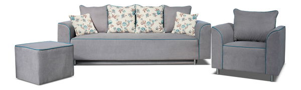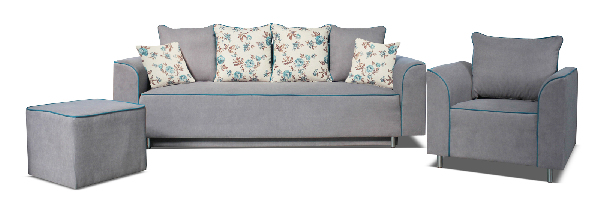 Moderná sedacia súprava pozostávajúca z pohodlnej sedačky, kresla a taburetky. Jednotlivé segmenty sú doplnené o výrazné obšitie. Podrúčky sedačky a kresla sú zaoblené. Výhodou sedacej súpravy je možnosť rozkladu sedačky a úložný priestor pre posteľnú bielizeň alebo ďalšie doplnky. Vaši priatelia a známi tak budú mocť pohodlne prespať, ak sa u vás dlhšie zdržia.