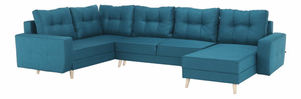 Predstavujeme vám prestížnu sedaciu súpravu Vellin U (L), ktorá splní aj tie najnáročnejšie predstavy o dokonalosti. Skutočná pastva pre oči, perfektný spoločník na leňošenie. Prichádza v štýlovom, no zároveň modernom a sviežom dizajne. Ideálna do interiérov zariadených v škandinávskom štýle. V tvare U poskytne miesto na sedenie pre každého člena rodiny. Oblečená je do tyrkysovej látky, ktorá sedačke dodáva mladistvý vzhľad. Súčasťou je aj šesť operadlových vankúšov s dekoratívnym šitím. Keď si budete chcieť oddýchnuť a užiť čas s blízkymi, využite funkciu rozkladu. Získate tak plochu na spanie až 120 x 262 cm. Sedačka tiež poskytuje úložný priestor. Uložte si doň všetko, čo potrebujete mať poruke. Vellin je univerzálny. Môžete ho poskladať podľa vlastnej potreby s rohom na pravej alebo ľavej strane. Kúpa sedacej súpravy je naozaj dôležitým rozhodnutím a s touto kráskou rozhodne nešliapnete vedľa.