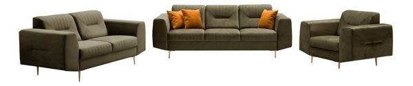 Súčasťou zostavy je 3-sed, 2-sed a kreslo. Čalúnená je látkou v zelenej farbe. Eleganciu jej dodávajú aj kvalitné kovové nohy v medenom prevedení. Výplň sedačky je pružina falista a HR pena.