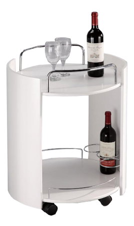 Praktický servírovací stolík Carlsen, ktorým pohodlne obslúžite svojich blízkych, kamarátov alebo zákazníkov. Využitie nájde takisto v hoteloch a reštauráciách. Boky stolíka sú z ohýbaného dreva, vrchná a spodná doska z MDF a doplnky sú chrómované. Lakovaný je bielou farbou. Pre lepšiu manipuláciu sú v spodnej časti umiestnené štyri kolieska.