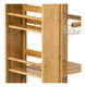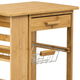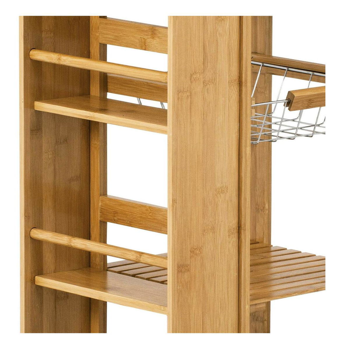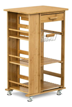 Servírovací stolík je šikovné a praktické doplnenie do každej domácnosti. Plní funkciu nielen pri servírovaní, ale výborne slúži ako mobilný úložný priestor, a to nielen do kuchyne. V troch poschodiach ponúka variabilitu možností ukladania. Spodné a prvé poschodie tvoria pevné roštové poličky na možné uloženie ťažšieho riadu a nad nimi je výsuvný drôtený kôš s praktickou drevenou úchytkou. Ten ponúka nepreberné možnosti ukladania od ovocia až po riad či iné kuchynské potreby. Doska aj konštrukcia je zhotovená z masívneho štiepaného bambusu v prírodnom odtieni, opatrená silnou doskou odolného transparentného laku. Tým je zaručená eliminácia poškodenia dosky rozliatou tekutinou. Navyše bambus ako taký odpudzuje vodu. Krytý úložný priestor tvorí jedna menšia zásuvka s dreveným madlom. Tu je možné uložiť príbory či drobné kuchynské predmety, príp. ako skryté miesto na sladkosti. Z jedného boku má stolík 3 poličky na umiestnenie fliaš so zábranami proti vypadnutiu a rozliatiu. Väčšie kolieska sú plastové, obe predné sú opatrené brzdičkami. Kôš je zvarený z kovových drôtov a chrómovaný. Veľkosť bambusovej dosky je 50 x 37 cm, čo je príjemné zväčšenie kuchynskej plochy a navyše mobilné. Vozík svojou univerzálnosťou, prevedením a designovou čistou je možné využiť vlastne akokoľvek podľa svojej fantázie. Len majte na pamäti, že maximálna nosnosť vozíka je skvelých 20 kg.