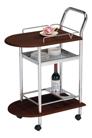 Pekný servírovací stolík B-408 s tromi odkladacími úrovňami v tmavom farebnom prevedení z dreva. V spodnej časti sa nachádza držiak na fľaše. Stolík je samozrejme na kolieskach.