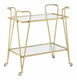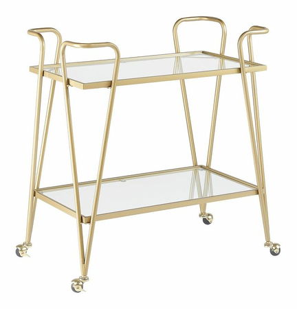 Tento kuchynský vozík vyrobený v štýle art deco sa stane stredobodom každého interiéru. Kolieska s brzdami vám umožnia bezpečne dosiahnuť na predmety na vozíku, bez toho aby sa vozík pohol z miesta. Jeho rám je vyrobený z kovu lakovaného zlatou farbou, ktorý dopĺňajú dve priehľadné sklenené plochy. Jeho dizajn pripomína dekorácie plesových sál zo slávnych hollywoodskych filmov.