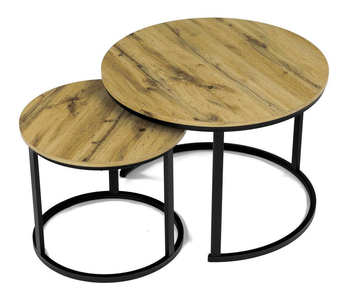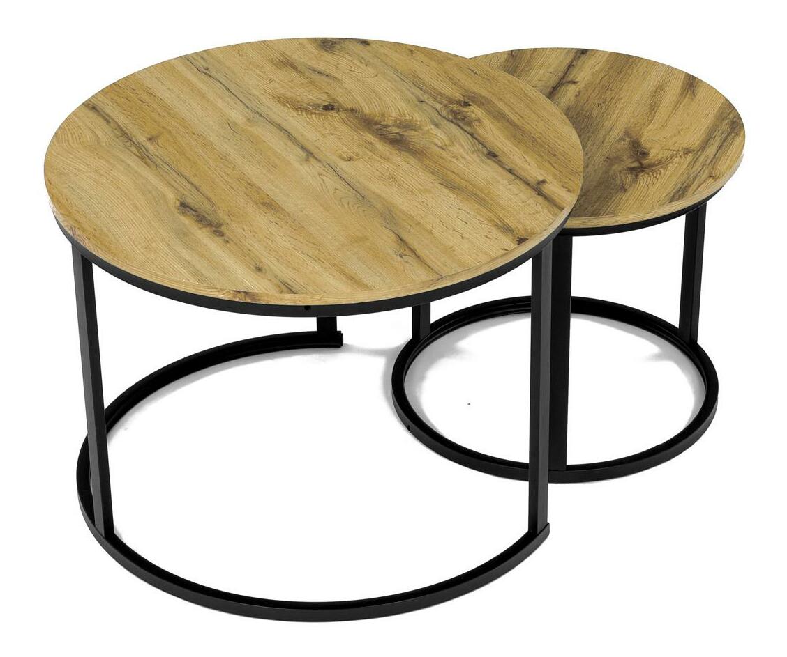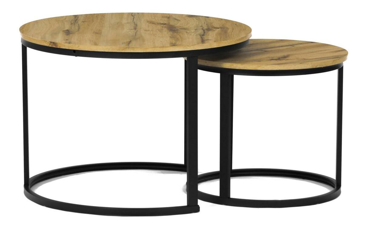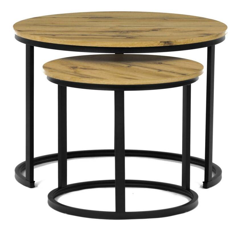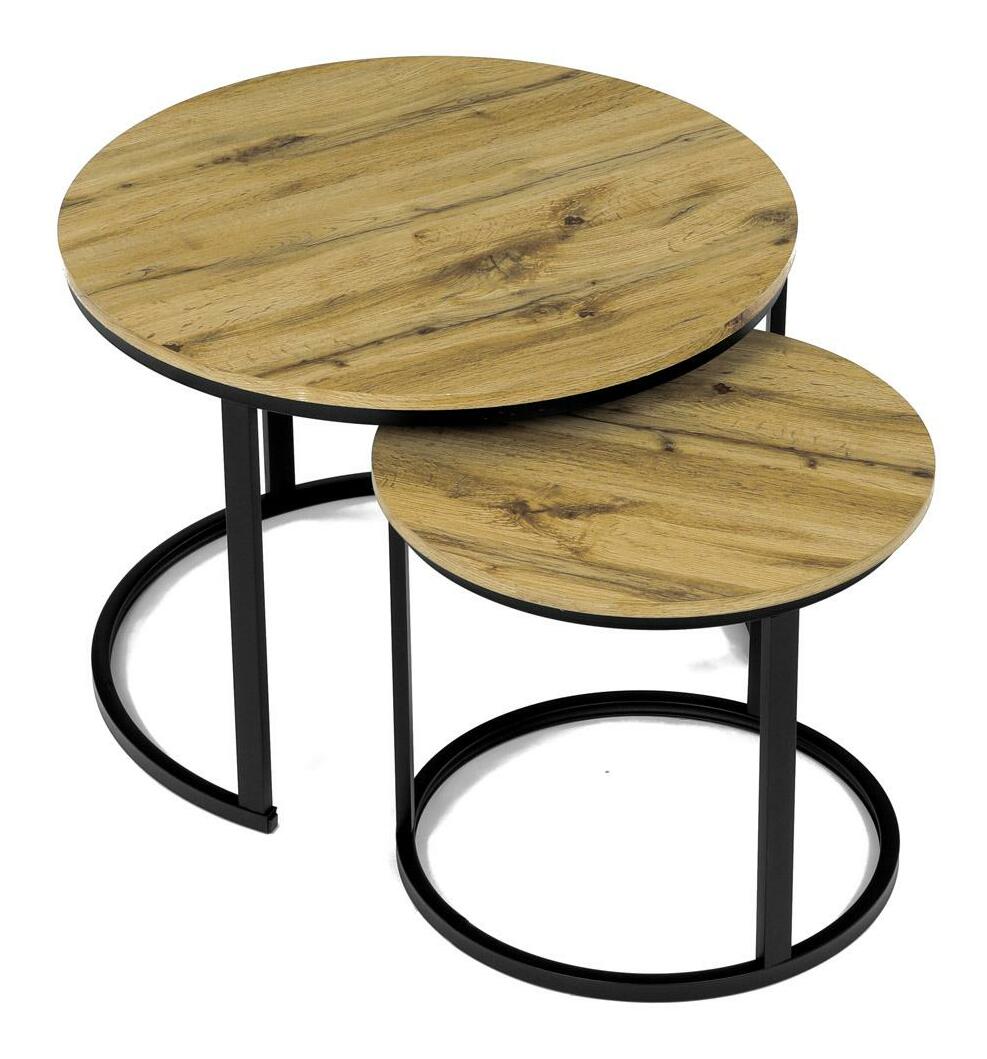 Súprava dvoch konferenčných stolíkov v industriálnom štýle prinesie do vašej obývačky eleganciu a praktickosť. Dosky z MDF s dekorom divokého duba v kombinácii s čiernymi kovovými nohami vytvárajú štýlový kontrast. Kruhový dizajn a možnosť menšie stolík ľahko umiestniť pod väčšiu ponúka flexibilitu pre úsporu miesta. Matný povrch dosky je ľahko udržiavateľný a odolný voči poškodeniu. Tento set je ideálny ako pre menšie priestory, tak aj pre interiéry, kde vynikne svojim moderným vzhľadom a funkčným dizajnom.