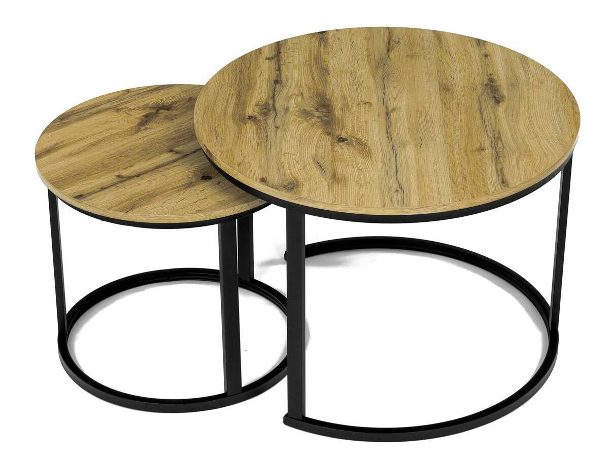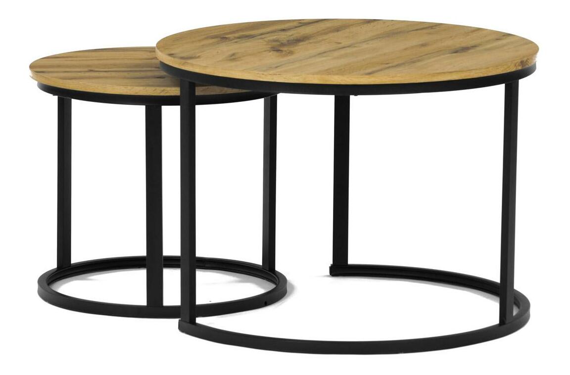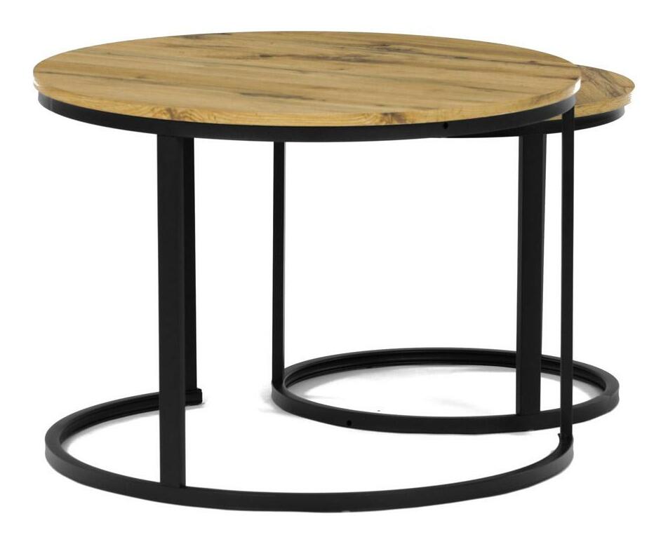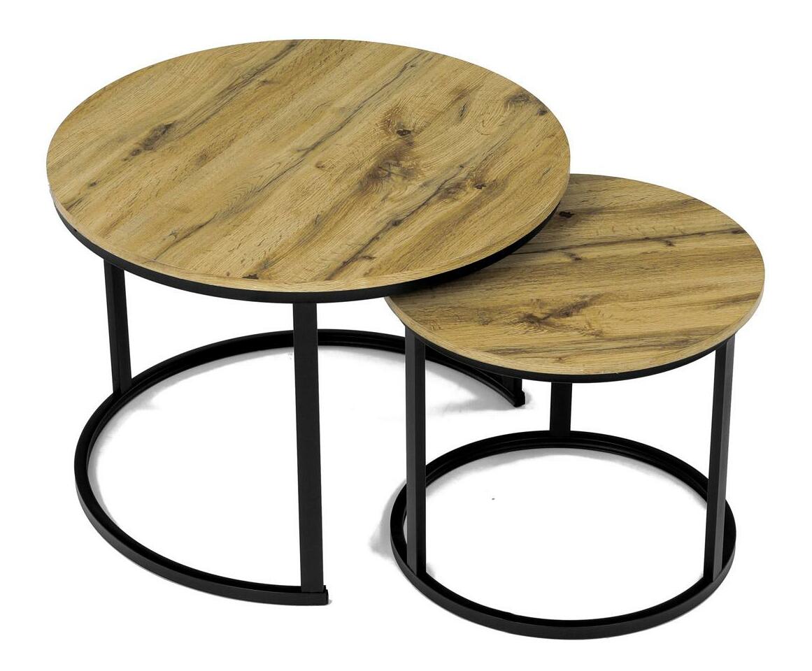 Súprava dvoch konferenčných stolíkov v industriálnom štýle prinesie do vašej obývačky eleganciu a praktickosť. Dosky z MDF s dekorom divokého duba v kombinácii s čiernymi kovovými nohami vytvárajú štýlový kontrast. Kruhový dizajn a možnosť menšie stolík ľahko umiestniť pod väčšiu ponúka flexibilitu pre úsporu miesta. Matný povrch dosky je ľahko udržiavateľný a odolný voči poškodeniu. Tento set je ideálny ako pre menšie priestory, tak aj pre interiéry, kde vynikne svojim moderným vzhľadom a funkčným dizajnom.