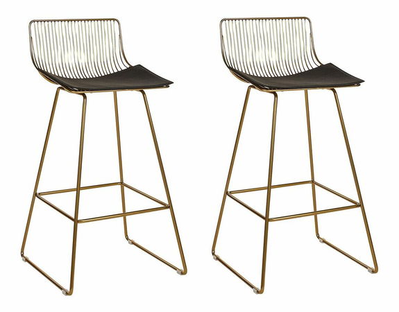 Táto súprava barových stoličiek, ktorá je vyrobená z kovu so zlatou povrchovou úpravou, pôsobí luxusne a vnesie štipku industriálneho štýlu do akéhokoľvek priestoru. Podušky na sedenie sú čalúnené čiernou umelou kožou a poskytujú pohodlné sedenie. Otvorená kovová konštrukcia nízkych operadiel nielenže skvele vyzerá, ale aj poskytuje dokonalú oporu vašej chrbtici. S touto štýlovou súpravou stoličiek získa vaša kuchyňa alebo jedáleň úplne nový vzhľad.