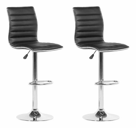 Táto súprava barových stoličiek je pohodlná a moderná a doplní akýkoľvek súčasný interiérový dizajn. Hrubo vystužené sedadlá sú čalúnené čiernou umelou kožou s horizontálnym prešívaním. Tmavá farba pomáha pozdvihnúť vzhľad vášho interiéru a navodiť pocit pokoja. Nohy sú vyrobené z kvalitného pochrómovaného kovu, majú podnožku a široký protišmykový základ. Stolička je otočná o 360 stupňov a je výškovo nastaviteľná.