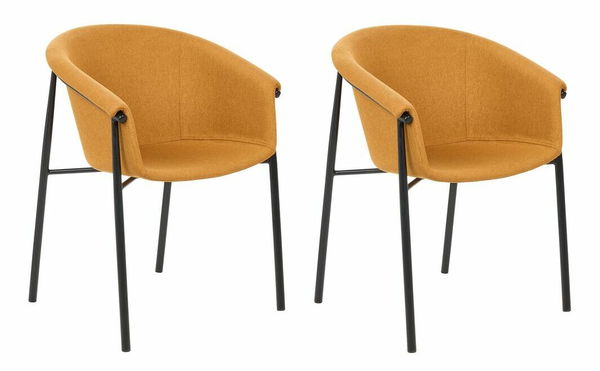 Skrášlite svoj jedálenský kút pomocou tejto sady 2 moderných čalúnených jedálenských stoličiek. Ich najväčšou prednosťou sú pohodlné hlboké sedadlá s oranžovým čalúnením, ktoré dokonale dopĺňajú čierne železné nohy. Okrem toho, že sú obe stoličky veľmi pohodlné, sú veľmi štýlové, pôsobia luxusne a dokonale zapadnú do akéhokoľvek moderného interiéru.