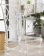 Nezvyčajné stoličky, ktoré aj napriek tomu, že sú bezfarebné, určite pritiahnu pohľady každej návštevy. Stoličky sú vyrobené z priehľadného materiálu a ladia s okolím bez toho, aby vizuálne narúšali dizajn miestnosti. Napriek nízkej hmotnosti zaisťujú pri sedení stabilitu a pohodlie. Zaujímavý dizajn v kombinácii s klasickým tvarom stoličiek vynikne v moderných interiéroch v štýle glamour.