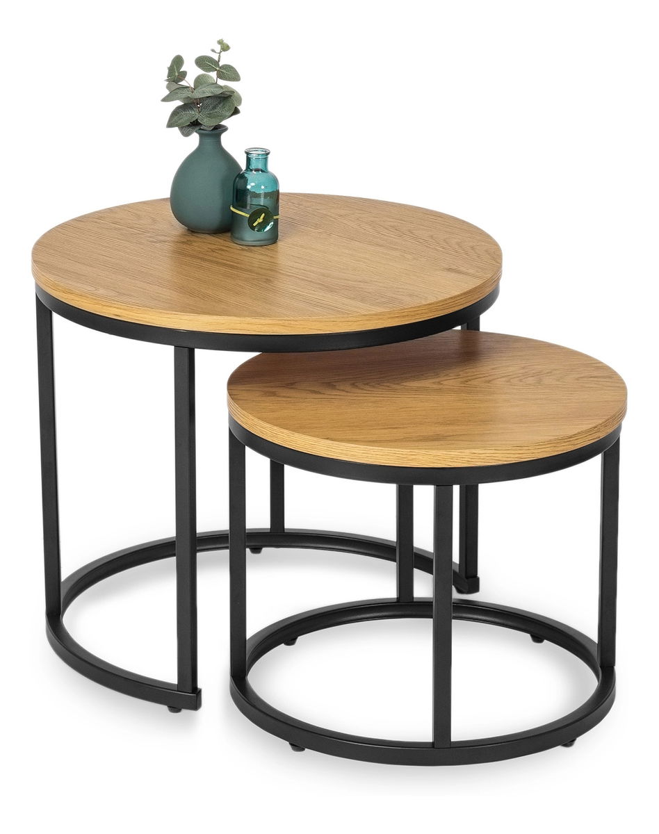 Set 2 ks konferenčných stolíkov Dalila prináša do vášho obývacieho priestoru harmóniu prírodného dreva a moderného kovového rámu. Táto kombinácia zaručuje pevnosť, stabilitu a vynikajúcu odolnosť, zatiaľ čo príjemný teplý odtieň drevodekoru dopĺňa akýkoľvek štýl – od industriálneho, cez škandinávsky až po minimalistický interiér.