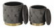 Dodajte svojmu interiéru retro nádych pomocou tejto súpravy zamatových úložných taburetiek. Trendová sivá farba v kombinácii so zlatým podstavcom vyzerá veľmi efektne. Jedinečný dizajn je podčiarknutý prešívaním s gombíkmi a hrubšími textilnými niťami, ktoré na povrchu vytvárajú vzor v tvare diamantu. Priestranný úložný priestor skrytý pod vekom oboch taburetiek využijete na odkladanie menších prikrývok a vankúšov.