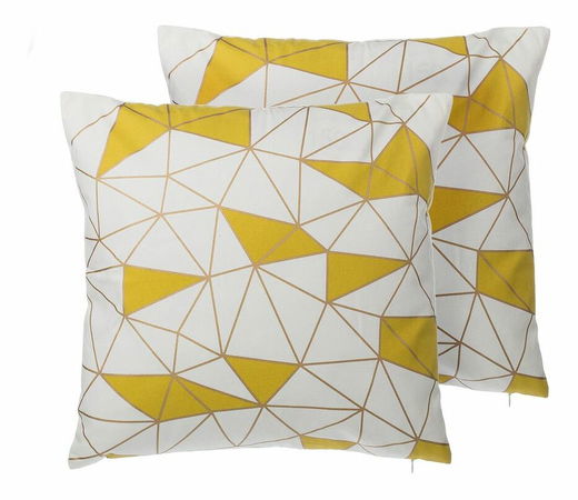 Táto súprava vankúšov dodá každému interiéru moderný vzhľad. Vankúše vynikajú najmä vďaka zlatým líniám fóliovej potlače usporiadaným do trojuholníkového vzoru v bielej a žltej farbe. Môžete ich umiestniť na posteľ, stoličku alebo pohovku a skombinovať s inými vankúšmi. Okrem toho, že sú dekoratívne, sú tiež veľmi praktické a vďaka ľahkej penovej výplni ideálne na relax. Poťahy s praktickými zipsami sú vyrobené z bavlny, ktorá sa vyznačuje svojou priedušnosťou a mäkkosťou.