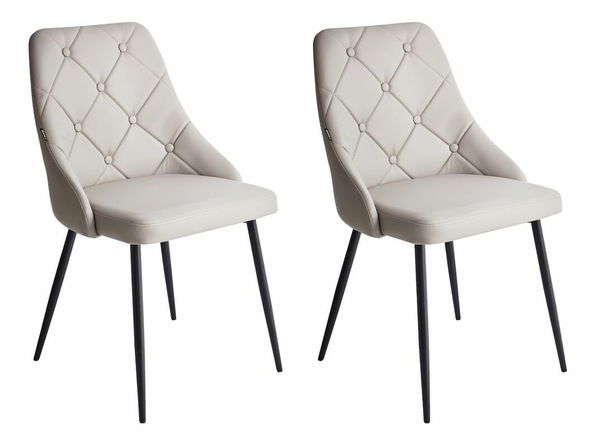 Tieto jedálenské stoličky dodajú nádych elegancie akejkoľvek jedálni. Stoličky s klasickým dizajnom a luxusným vzhľadom sú čalúnené umelou kožou v sivej farbe. Operadlá s prešívaním doplnené ozdobnými gombíkmi a mäkké sedadlá vytvárajú pohodlný priestor na sedenie. Stoličky sú doplnené štíhlymi čiernymi nohami vyrobenými z kovu, ktoré dopĺňajú ich celkový vzhľad.