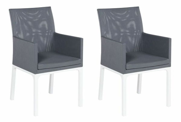 Hliníková súprava záhradných stoličiek v klasickom dizajne a neutrálnej farbe, ktorá sa dobre hodí k akémukoľvek vonkajšiemu zariadeniu. Stoličky s pohodlnými opierkami rúk a vysokým operadlom zaručujú jedinečné pohodlie. Sedadlá sú čalúnené odolným syntetickým materiálom odolným voči UV žiareniu a dodávajú sa s hrubými vankúšmi s poťahmi odolnými voči vode.