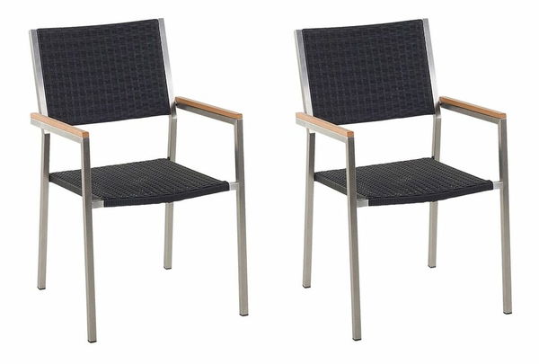 Táto súprava záhradných stoličiek je ideálnou voľbou na terasu alebo do záhrady. Rám stoličiek je vyrobený z odolnej ocele, ktorá zaručuje stabilitu, a drevené detaily na opierkach rúk vás ochránia pred chladnou kovovou konštrukciou. Sedadlo a operadlo sú vyrobené z čierneho umelého ratanu, ktorý je zárukou maximálneho komfortu.