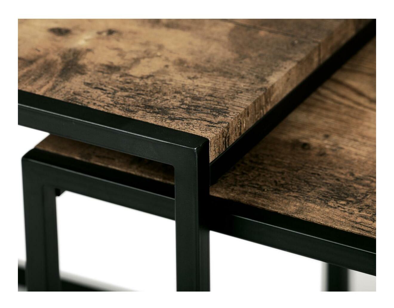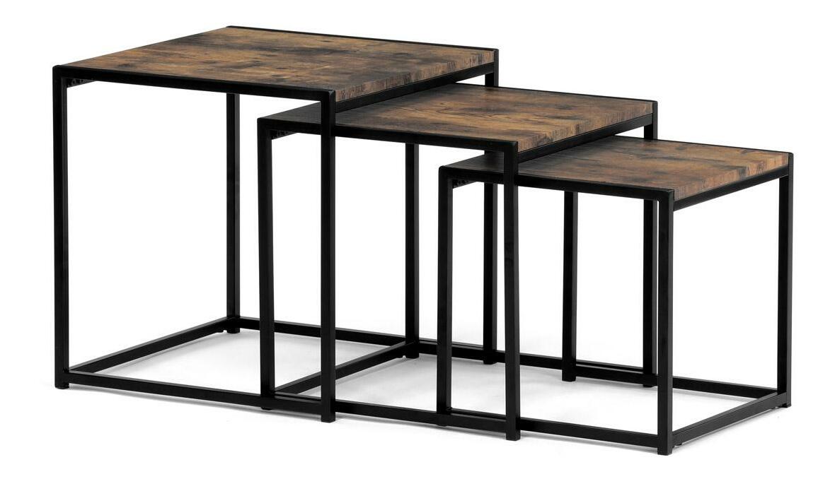Set 3 ks prístavných alebo odkladacích stolíkov prinesie do Vášho domova praktickosť, variabilitu, ale aj industriálny šarm. Stolíky môžete rozmiestniť jednotlivo po interiéri, kde Vám vytvoria zaujímavé odkladacie prvky v rôznych výškových hladinách. Alebo spoločne povytiahnuté, kde vytvoríte veľkú obdĺžnikovú stupňovitú odkladaciu plochu. Veľkou výhodou je možnosť zasunutia stolíkov do seba, čo oceníte pri upratovaní, skladovaní alebo pri potrebe väčšieho priestoru. Štvorcové dosky z MDF v dekore staré drevo harmonicky dopĺňajú čierna kovová konštrukcia, ktorá tvorí aj nohy a celkovo stolíky spevňuje. Stolík určite zaujmú nielen svojim nadčasovým designom, ale aj variabilitou a praktickosťou. Dosky majú rozmer 35 x 35 x 35, 40 x 40 x 40 a 45 x 45 x 45 cm, hrúbku 1,5 cm. Konštrukcia je štvorcového prierezu, na spodných plochách opatrená plastovými klzákmi. Nosnosť jednotlivého stolíka je do 15 kg.