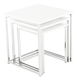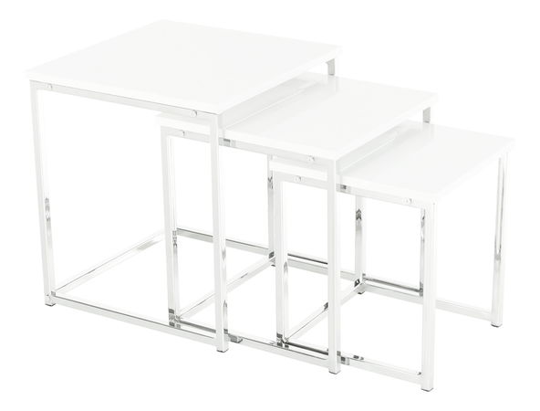 Set 3 konferenčných stolíkov Edissa typ 3 s výškou 42 cm a hĺbkou 40 cm je ideálnym doplnkom pre vaše obývacie priestory. Tento set obsahuje tri stolíky, ktoré sú vyrobené z MDF a kovu a majú biely extra vysoký lesk/chróm povrch. Väčší stolík má rozmer 40x40x42 cm, stredný stolík má rozmer 35x35x39 cm a menší stolík má rozmer 30x30x36 cm. Hrúbka materiálu je 15 mm. Tieto stolíky sú ľahko rozoberateľné, dodávané v demonte. Tento set stolíkov poslúži nielen ako praktický pomocník pri vašich kaviárskych večierkoch, ale aj ako moderný dizajnový prvok pre vašu domácnosť.