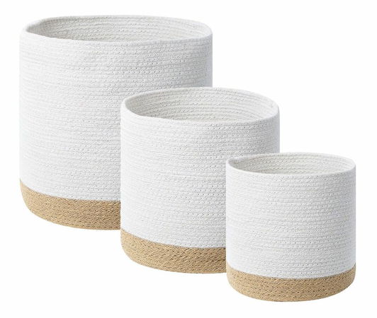 Táto súprava 3 dvojfarebných košíkov zvýrazní vzhľad každej miestnosti, do ktorej ju umiestnite. Vďaka nej získate extra úložný priestor na všetky potrebné veci, ktoré potrebujete mať na dosah ruky. Košíky sú ručne vyrobené z bavlny a juty a sú výnimočnou dekoráciou, ktorá vnesie do priestoru štipku prírodného dizajnu. Ak ich umiestnite do obývacej izby, spálne, detskej izby či dokonca kúpeľne, váš interiér bude usporiadaný a prehľadný.