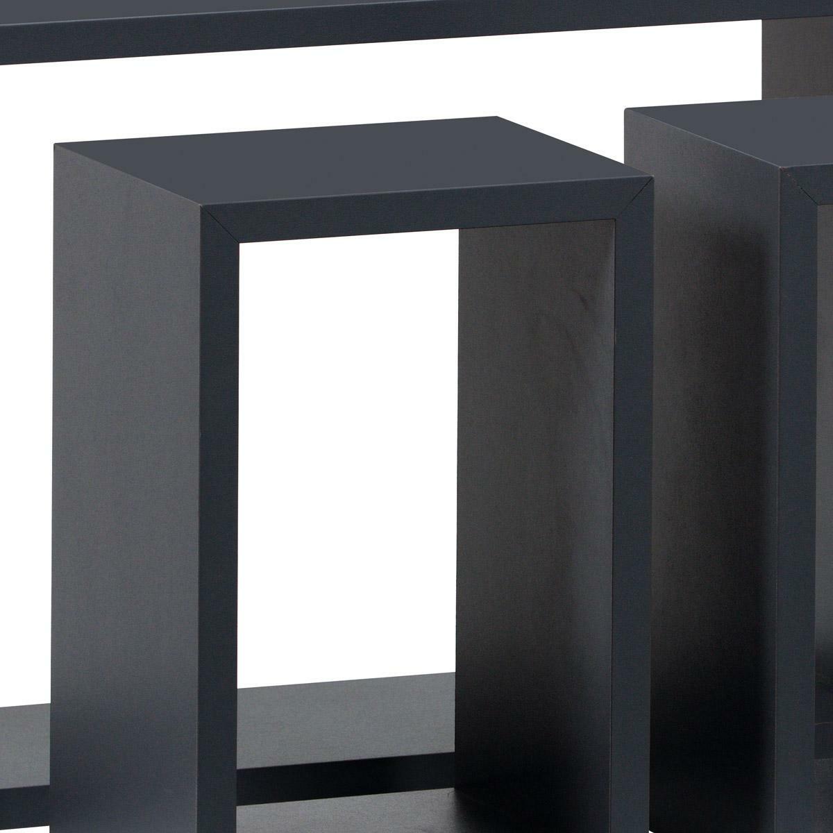 Súprava 3 ks moderných nástenných poličiek rôznych veľkostí v minimalistickom dizajne a obdĺžnikového tvaru. Prevedenie je v tmavo šedej matnej farbe s jemnou štruktúrou. Rám je z MDF, povrch matné lamino. Balenie obsahuje poličku, skrutky a hmoždinky na uchytenie. Nosnosť poličky je 5-15 kg podľa druhu nosného muriva. Rozmer políc je: 60x30x15x1.4 / 38x27x15x1.4 / 17x27x15x1.4