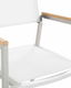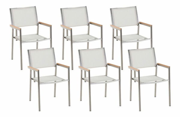 Táto súprava záhradných stoličiek je ideálnou voľbou na terasu alebo do záhrady. Rám stoličiek je vyrobený z odolnej ocele, ktorá zaručuje stabilitu, a drevené detaily na opierkach rúk vás ochránia pred chladnou kovovou konštrukciou. Sedadlo a operadlo sú vyrobené z bielej textilnej látky, ktorá je zárukou maximálneho komfortu.