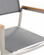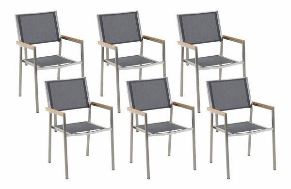 Táto súprava záhradných stoličiek je ideálnou voľbou na terasu alebo do záhrady. Rám stoličiek je vyrobený z odolnej ocele, ktorá zaručuje stabilitu, a drevené detaily na opierkach rúk vás ochránia pred chladnou kovovou konštrukciou. Sedadlo a operadlo sú vyrobené zo sivej textilnej látky, ktorá je zárukou maximálneho komfortu.