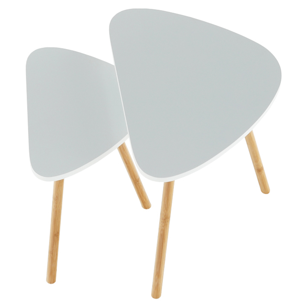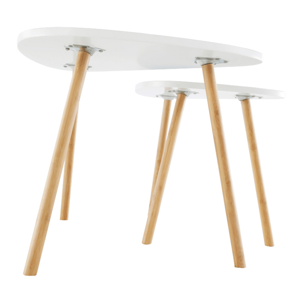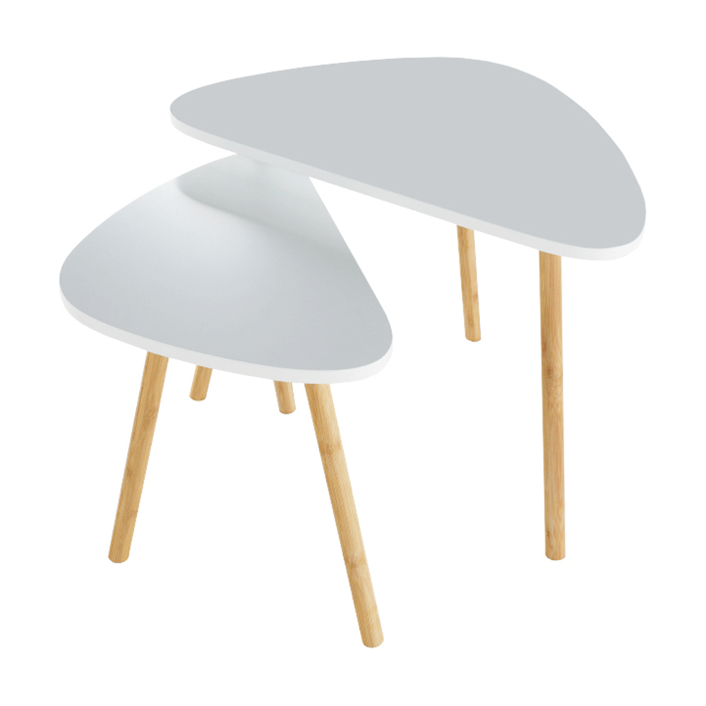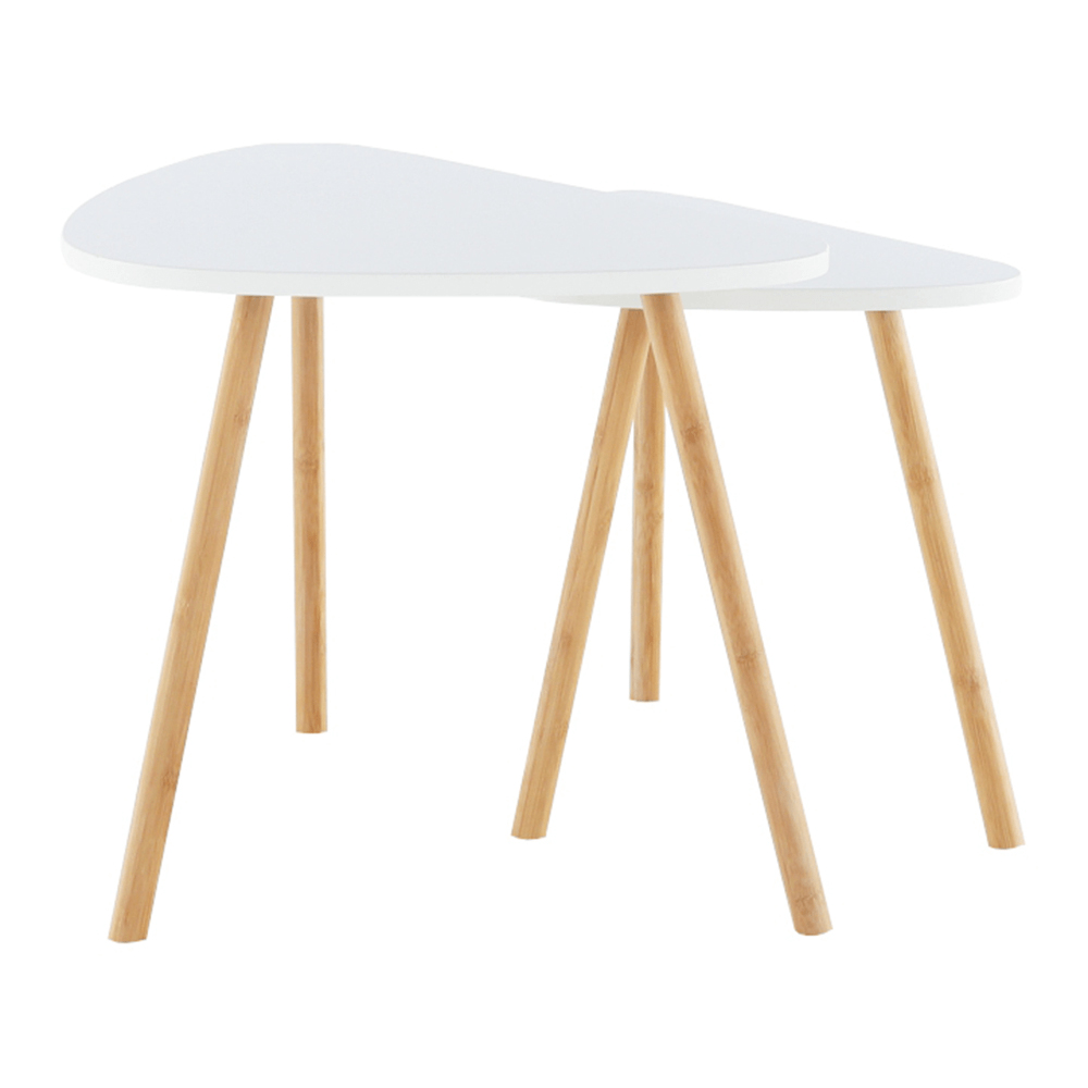 Set konferenčných stolíkov Brigan (2 ks.) Biela + Prírodná je ideálny pre tých, ktorí hľadajú elegantný a moderný nábytok pre svoj domov alebo kanceláriu. Sú vyrobené z kvalitného materiálu MDF a lakovaného bambusu, ktoré zaručujú stabilitu a odolnosť. Menší stolík má rozmery 40 x 46 x 30 cm a väčší stolík má rozmery 45 x 60 x 40 cm, takže sa ľahko prispôsobia akémukoľvek priestoru. Farba biela v kombinácii s prírodným bambusom dodáva celému setu štýlový vzhľad. Tento set stolíkov je dodávaný v demente a vynikajúco doplní váš interiér.