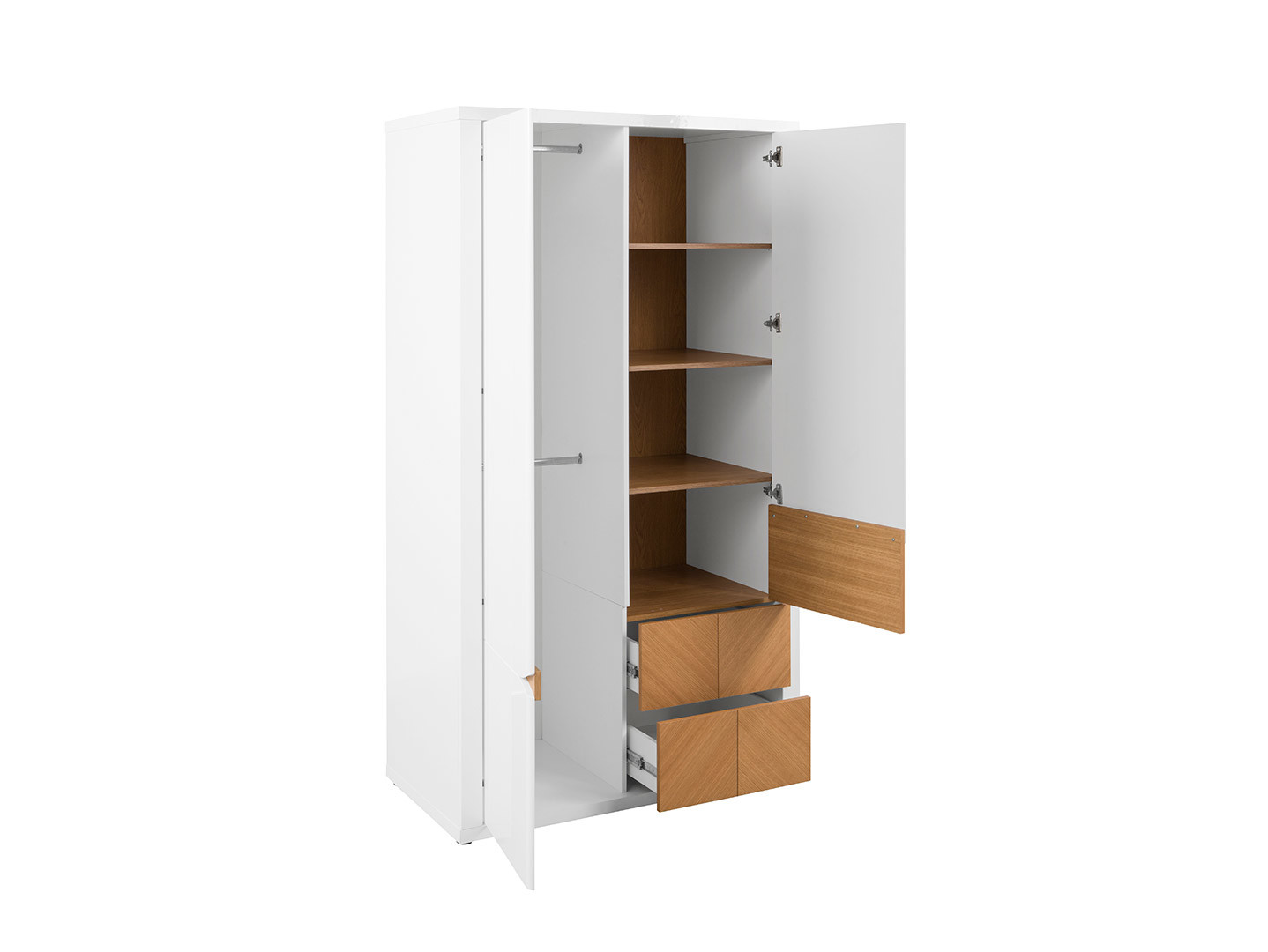 Skriňa Rovika SZF2D2S (lesk biely + dub prírodný) je originálna skriňa z kolekcie Roviko. Táto šatníková skriňa má výšku 202 cm a hĺbku 56,5 cm. Skriňa ponúka dostatok miesta na uloženie oblečenia a obsahuje 3 police pre dokonalé usporiadanie. Na druhej strane je dvoj-dverová skriňa s 2 závesnými tyčami. Skriňa má taktiež 2 zásuvky pre ďalšie uloženie vecí. Skriňa je vybavená tichým uzatváraním dvierok a zásuviek pre pohodlné a bezproblémové používanie. Zásuvky majú funkciu "push to open" pre bezúchytkové otváranie. Skriňa je vyrobená z kvalitných materiálov ako nábytková doska a fornir. Celkovo ide o skriňu, ktorá vám poskytne dostatok miesta na vaše oblečenie a iné veci a zároveň bude skvelo vyzerať vo vašej izbe.