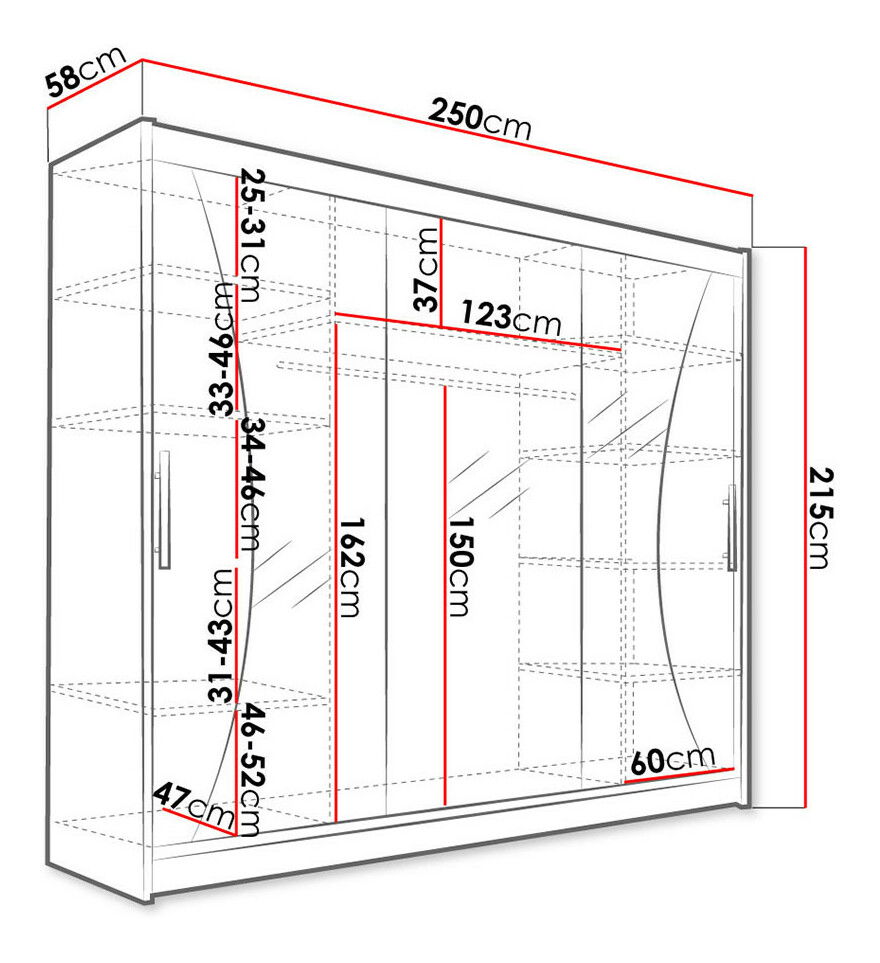 Skriňa Dasto 250 je ideálnou voľbou pre tých, ktorí hľadajú pohodlie a štýl. Skriňa s posuvnými dvermi Dasto 250 bude fungovať vo vašej domácnosti. Zmestia sa do nej veci dennej potreby, oblečenie a cestovné kufre. Dvere šatníka sa ľahko posúvajú a vertikálne zrkadlo namontované na stredných dverách miestnosť opticky zväčšuje. Priestranné police a tyč na vešiaky pomôžu oddeliť oblečenie. Kľučky namontované na dverách uľahčujú ich premiestňovanie v prípade potreby. Skriňa môže byť umiestnená v spálni alebo v predsieni ako miesto pre vrchné oblečenie. Celá konštrukcia šatníkovej skrine je vyrobená z laminovanej dosky. Rozmery: šírka: 250 cm výška: 215 cm hĺbka: 58 cm Farby: možnosť výberu farieb tu Vyrobené: drevotriesková doska laminovaná 16 mm, systém posuvných dverí, hliníkové lišty, vodiace lišty od firmy Sevroll, systém Micra, zrkadlo, osvetlenie LED RGB je možné si doobjednať za príplatok Záručná doba: 24 mesiacov
