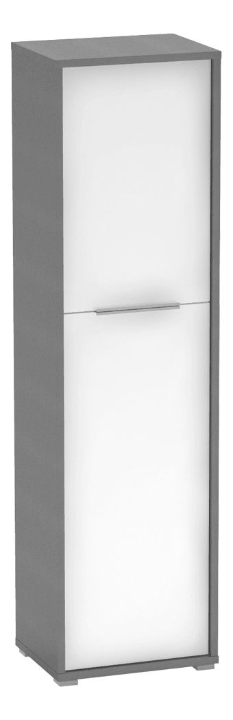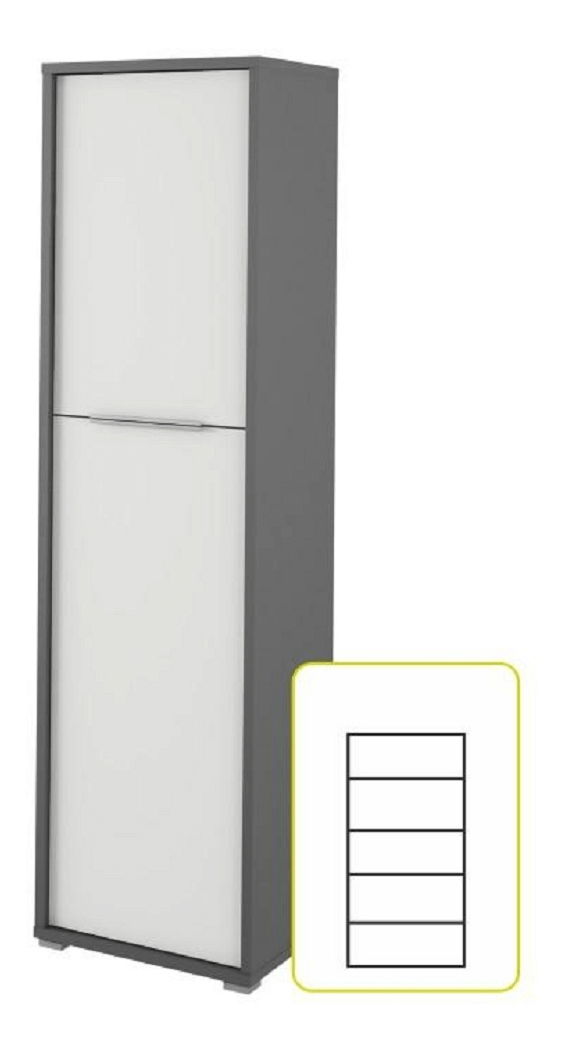 Skriňa Hamila NEW TYP 08 (grafit + biela) výška 182,6 cm hĺbka 38 cm Grafit/Biela je dizajnová minimalistická vysoká skriňa, ktorá sa hodí do modernej kancelárie alebo pracovne. Skriňa má päť políc ukrytých za dvomi dvierkami a je rozdelená na dve samostatné skrinky. Stojí stabilne na nízkych nožičkách a každá polica znesie maximálne 5 kg. Materiál skrine je DTD laminovaný s hrúbkou materiálu 1,6/2,2 cm a úchytky sú z kovu. Skriňa sa dodáva v demonte. S touto vysokou skriňou si dokážete udržať poriadok v kancelárii a mať všetko dôležité na svojom mieste.