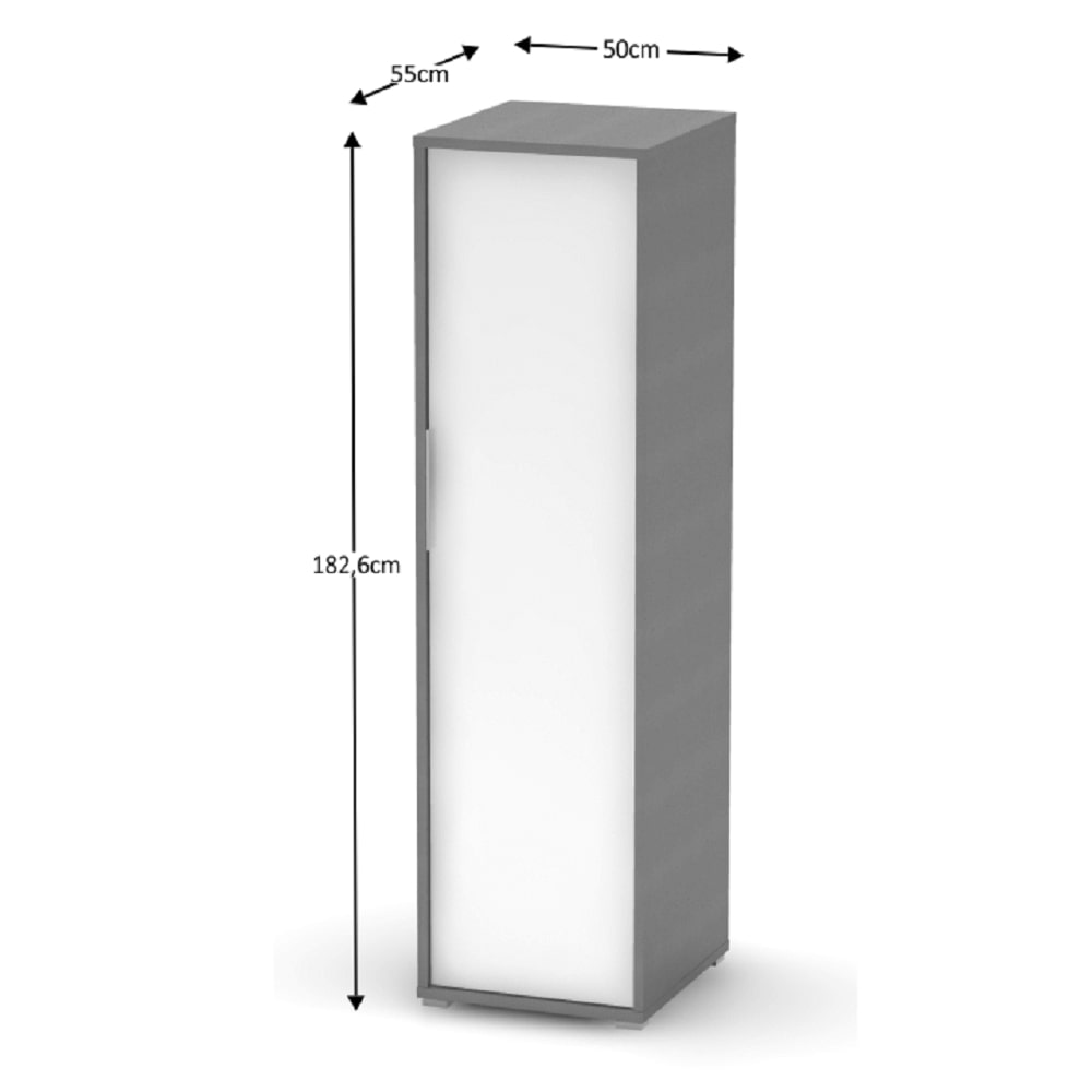 Šatníková skriňa Hamila NEW TYP 20 (grafit + biela) s výškou 182,6 cm a hĺbkou 55 cm je dizajnová minimalistická skriňa, ktorá sa hodí do modernej kancelárie alebo pracovne. Skriňa má jednu poličku a praktickú vešiakovú tyč, čím poskytuje dostatok úložného priestoru. Skriňa stojí stabilne na nízkych nožičkách. Každá polica má nosnosť až 5 kg a vešiaková tyč je zahrnutá. Materiál skrine je DTD laminovaná so šírkou materiálu 1,6/2,2 cm a úchytky sú vyrobené z kovu. Skriňa je dodávaná v demonte. S touto šatníkovou skriňou získate praktický a moderný kus nábytku pre vašu kanceláriu alebo pracovňu.
