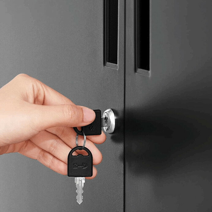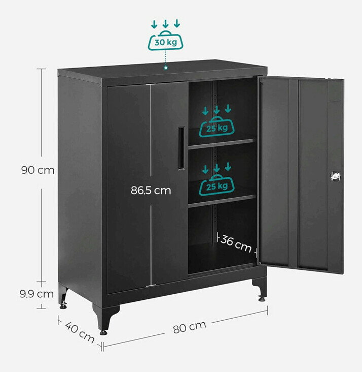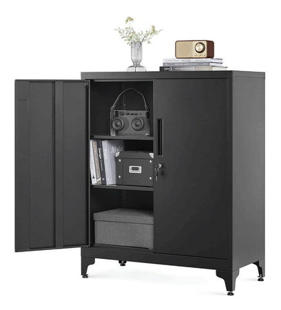 Úložná skrinka Autronic v čiernom prevedení je vyrobená z pevného kovu s práškovou povrchovou úpravou, ktorá zabezpečuje odolnosť proti poškodeniu a jednoduchú údržbu. Ponúka tri vnútorné police, ktoré poskytujú dostatok priestoru na organizáciu dokumentov, kancelárskych potrieb alebo drobných predmetov. Dvere sú vybavené praktickým zamykacím mechanizmom pre bezpečné uloženie obsahu. Stabilné kovové nohy s nastaviteľnými pätkami umožňujú vyrovnanie na nerovnom povrchu a zvyšujú celkovú stabilitu skrinky. Rozmery 80 x 40 x 100 cm ju predurčujú na využitie v kanceláriách aj domácnostiach, kde je potrebné efektívne a bezpečné úložisko.