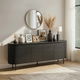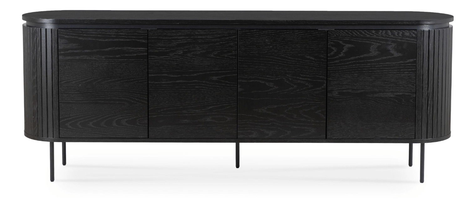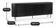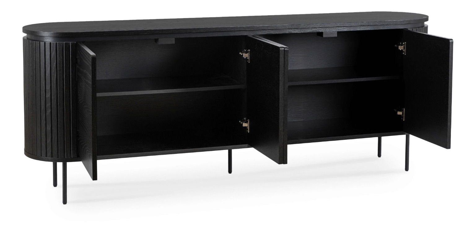 Čierna farba skrinky vytvára kontrast s neutrálne ladeným interiérom a zároveň zdôrazňuje jej výraznú prítomnosť, bez toho aby dominovala celému priestoru. Pre dokonalé doladenie obývacej izby môžete zvoliť aj minimalistické TV stolíky, ktoré podčiarknu moderný charakter nábytku.