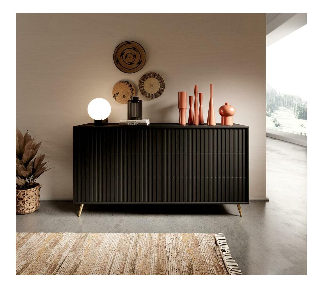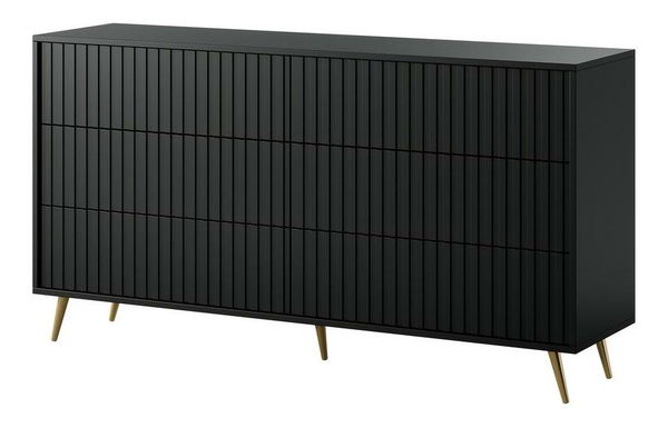 ZobraziťMáte radi klasický nábytok s moderným nádychom sviežosti? Výberom kolekcie vnesiete do svojho interiéru elegantný, no klasický vzhľad Komoda bude skvelou voľbou pre ľudí, ktorí potrebujú veľa úložného priestoru. Nábytok má šesť priestranných odolných zásuviek, do ktorých schováte všetky svoje veci. Ďalšou výhodou je priestranná stolová doska, kde si môžete vystaviť suveníry z dlenky, fotografie vašich blízkych alebo zbierku malých sukulentov. Čelo má vkusný dekor v podobe lamiel, dodávajúcich komode originálny vzhľad Detaily produktu: korpus vyrobený z laminovanej dosky Kronospan 190 PE s hrúbkou 16 mm, pričom čelá sú vyrobené z odolnej MDF dosky s. ozdobné lamely, zlaté nohy s výškou 15 cm dodávajú nábytku eleganciu a uľahčujú udržiavanie poriadku, matné prevedenie čiel a korpusu, maximálna nosnosť zásuvky: 5 kg, zásuvky vybavené systémom push to open, nábytok pre seba -zhromaždenie.