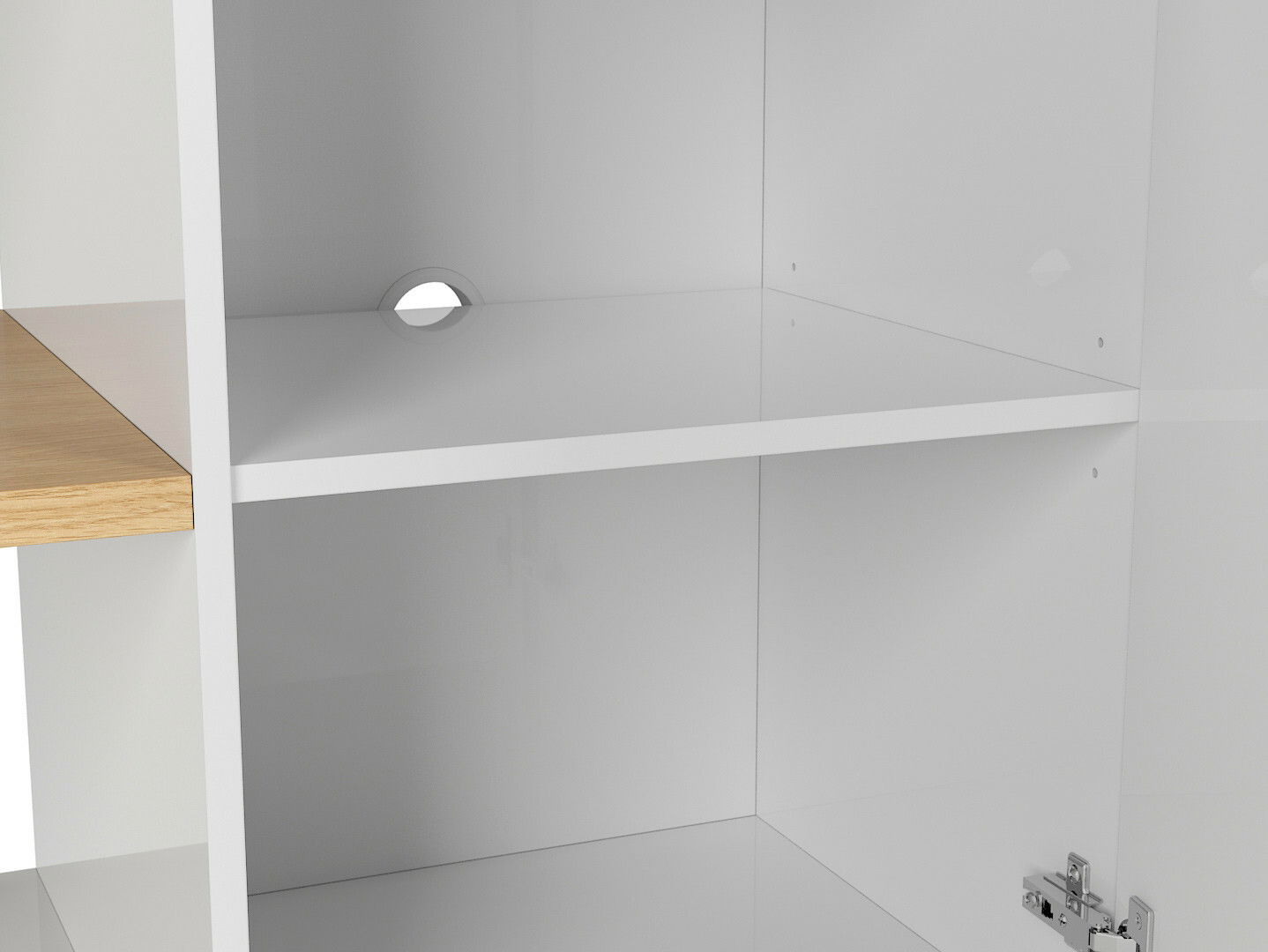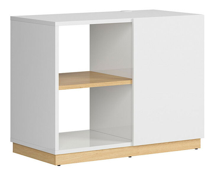 Skrinka Denton REG1D/100/75 s výškou 78,5 cm a hĺbkou 51,5 cm je vyrobená z kvalitnej drevotriesky s povrchom pokrytým tvrdou fóliou, ktorá zvyšuje jej odolnosť voči vonkajšiemu poškodeniu. Jej moderný dizajn v dubovom a lesklom biele farbení okrem estetického pôsobenia ponúka aj praktické úložné riešenia. V ľavej časti sa nachádza polička a dva otvorené úložné priestory, v pravej časti je skrinka s jednou policou vo vnútri s maximálnou nosnosťou do 5 kg. Táto skrinka bude výborne slúžiť v obývačke, spálni alebo pracovni a bude skvelým doplnkom akéhokoľvek interiéru.
